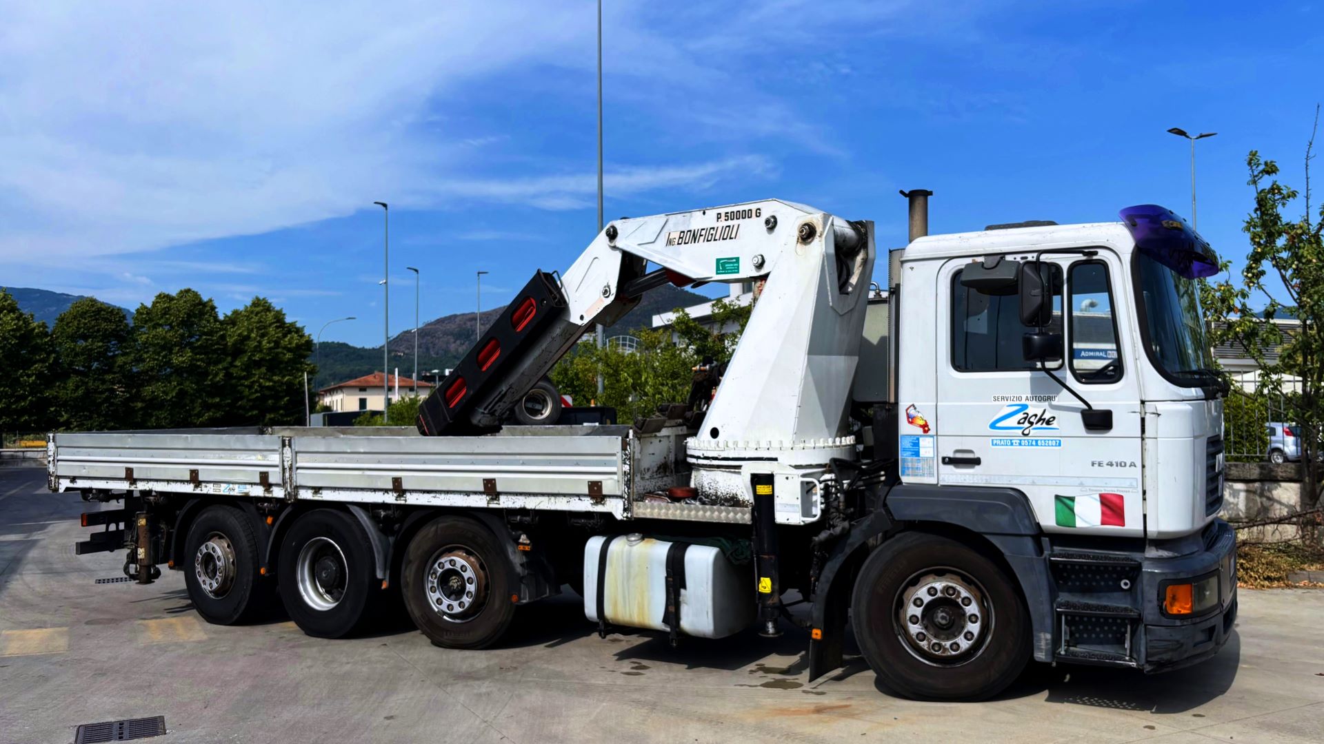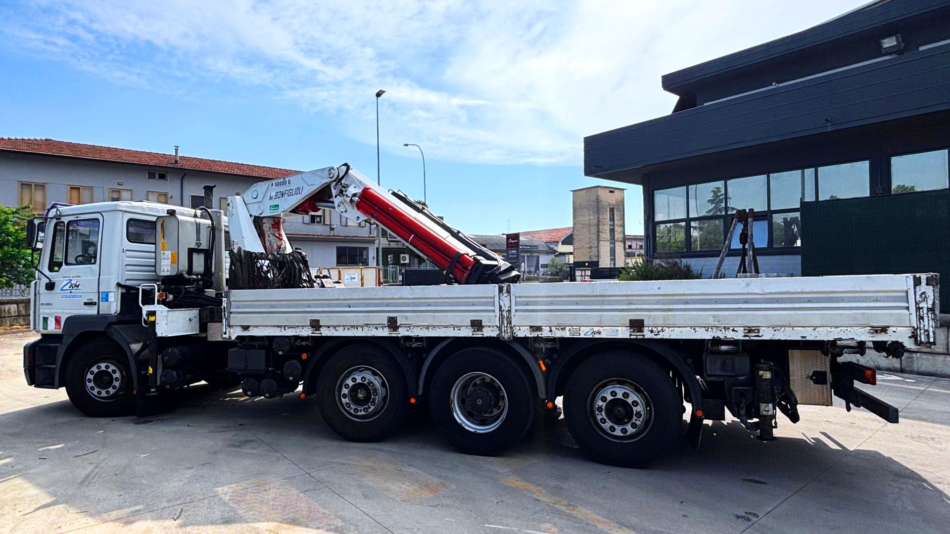 Il Camion Gru MAN F2000 400 CV a 4 assi, equipaggiato con gru Bonfiglioli G50000, rappresenta una soluzione versatile per operazioni di sollevamento sia in ambienti aperti che spazi chiusi.