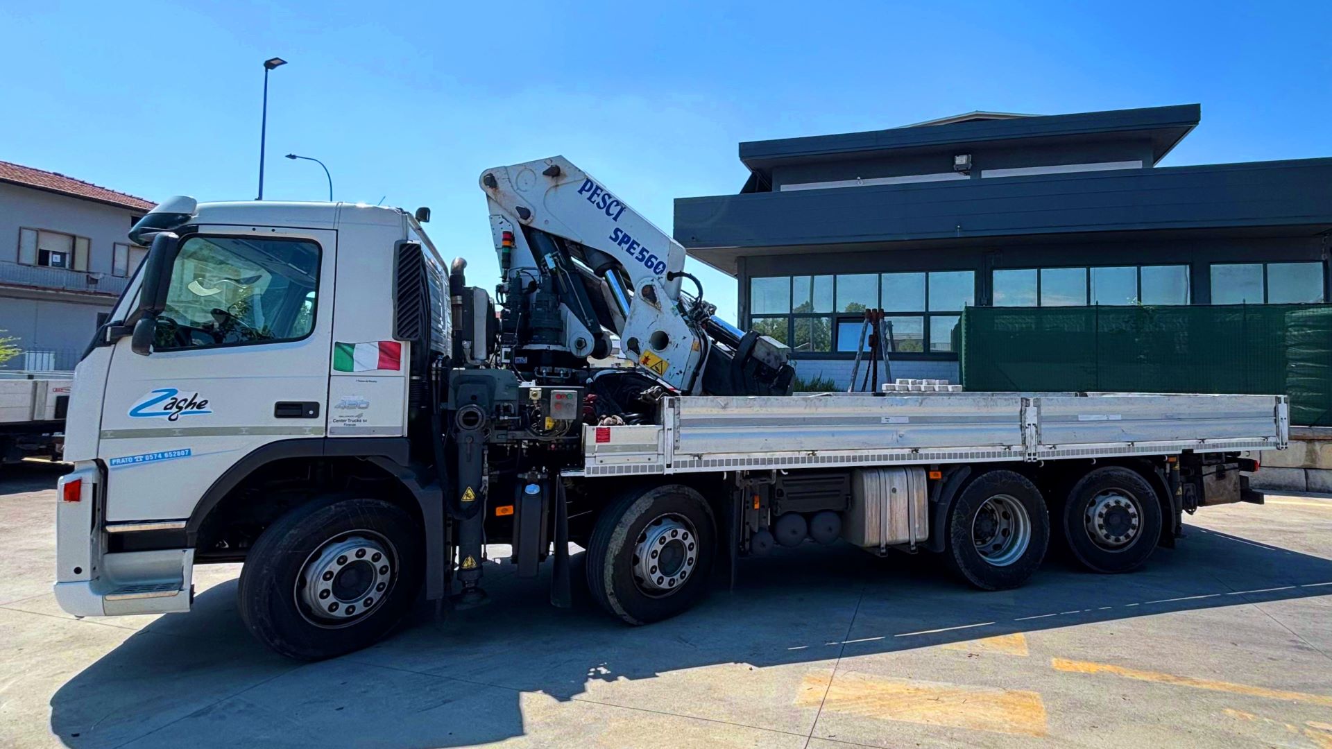 Il Camion Gru Volvo 480 CV a 4 assi equipaggiato con gru Pesci SPE560 offre prestazioni elevate per il sollevamento e il trasporto di carichi pesanti, anche in spazi ridotti.