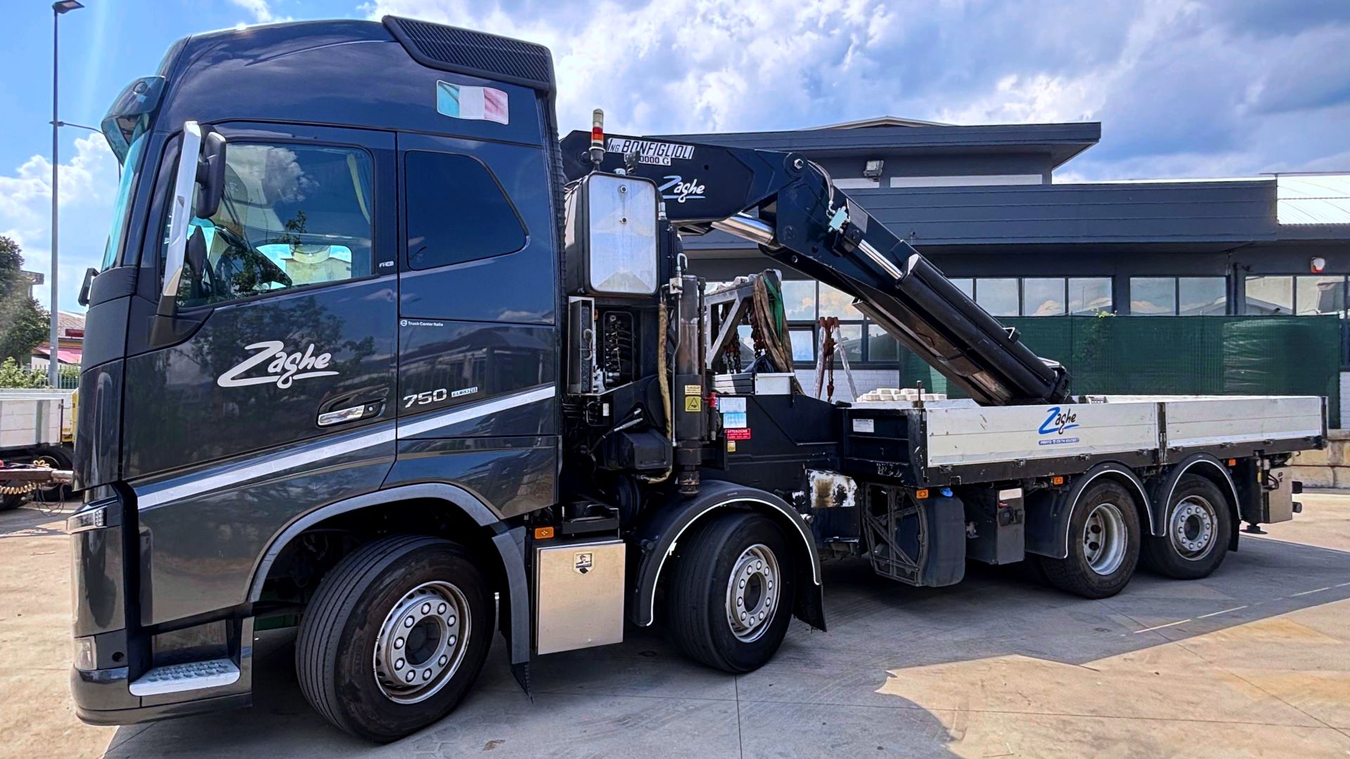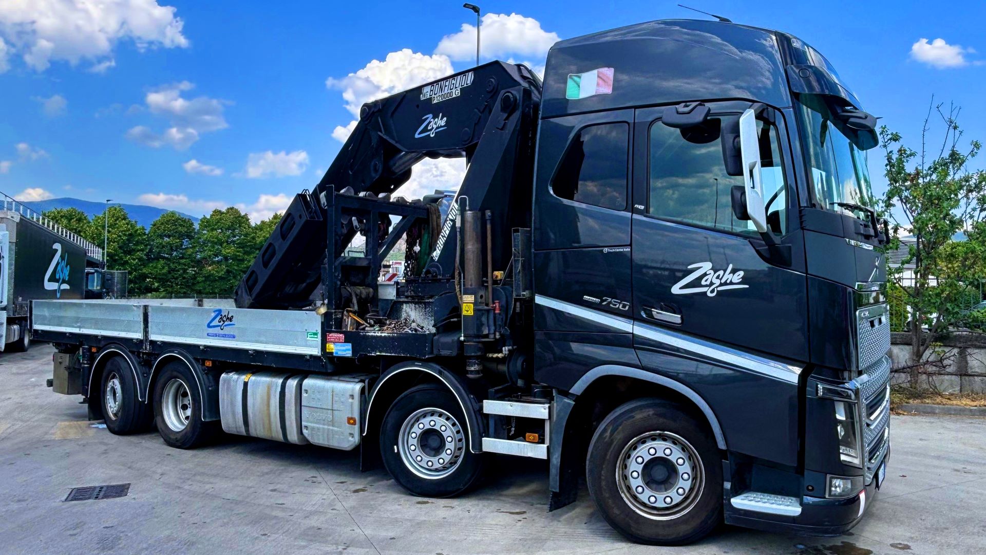 Il Camion Gru Volvo 750, equipaggiato con gru Bonfiglioli 120000, è progettato per operazioni di sollevamento precise e affidabili in cantieri e ambienti industriali.